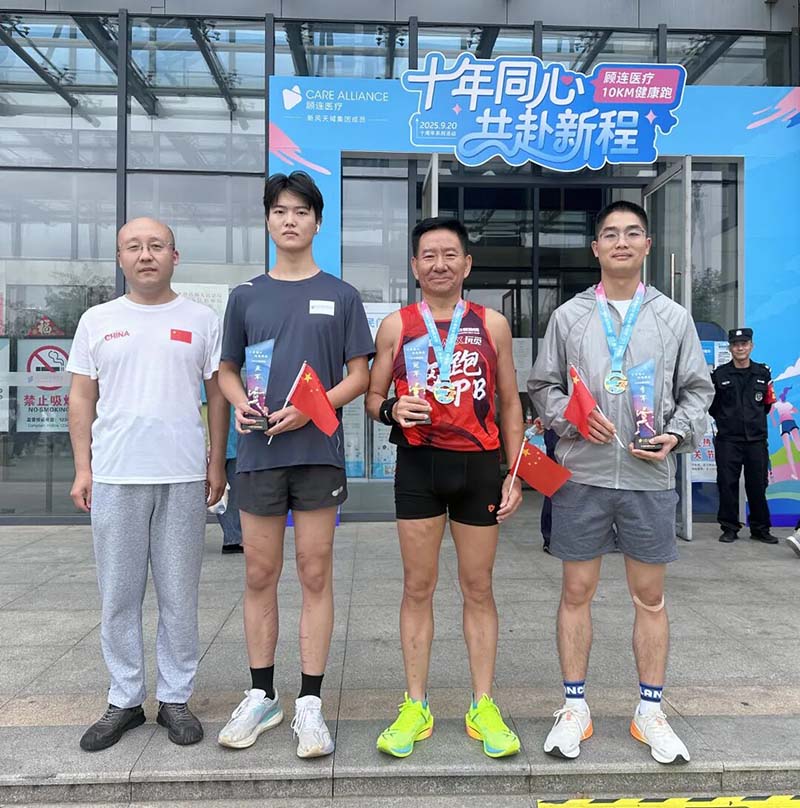 赛道之上,既有全力冲刺的拼搏,也有笑语相伴的坚持。来自保安部的关永斌凭借过人的耐力和速度率先冲过终点,摘下桂冠;成人康复治疗部的康复治疗师范宸晗与成人康复治疗部治疗师长彭涛分获亚军、季军。