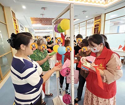 一盏盏悬挂着各式各样灯谜的花灯,将活动现场装点得充满了节日气氛。“什么东西,白天是白的,晚上是黑的?”、“什么东西,越洗越脏?”……各式各样的灯谜,吸引了众多患者及家属驻足。大家或独自思考,或互相讨论,开动脑筋,积极思考。猜对灯谜的幸运儿们来到党员志愿者的手中领取兑奖券,排队领取美味的月饼或精美中秋礼品,脸上洋溢着幸福的笑容。